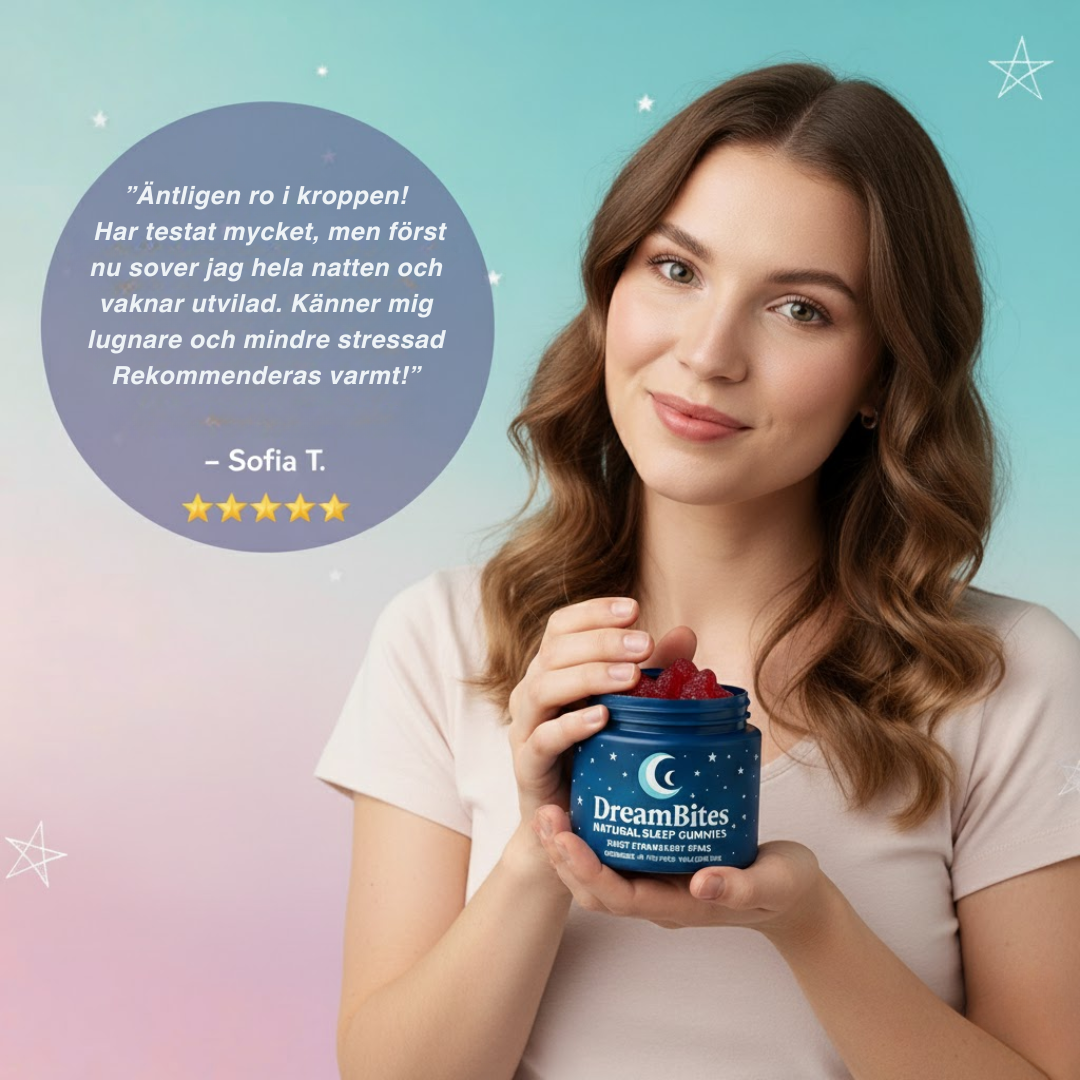 DreamBites använder L-theanin, magnesium och växtbaserade extrakt som lugnar nervsystemet och hjälper dig somna utan piller, melatonin eller biverkningar. En naturlig väg till lugnare kvällar och stabilare sömn.
